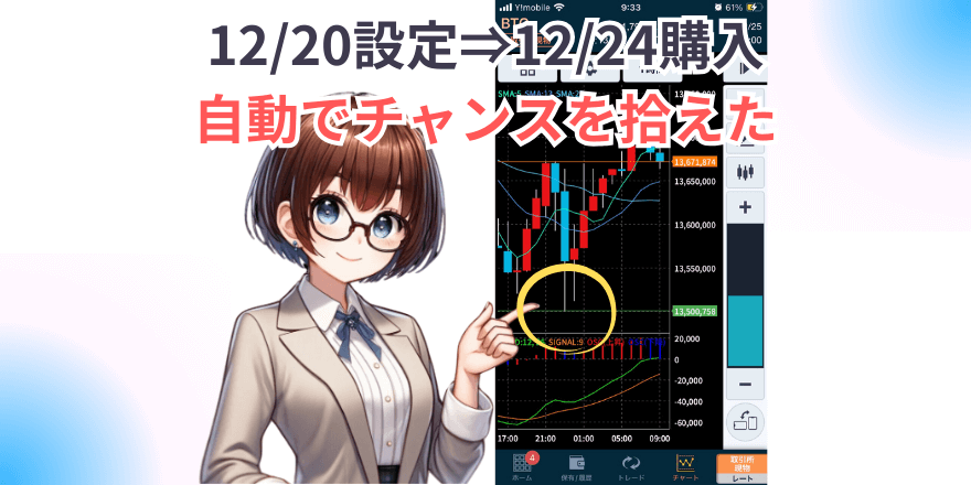 現在価格では買わず「安くなったら自動で買う」という動きを機械に任せられるため、暴落買いと非常に相性が良い仕組みです。