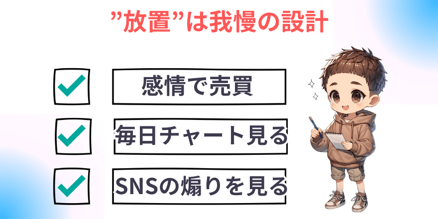 価格が上がったら欲が出て買い増し、下がったら怖くなって売る。こうした感情ベースの行動が一番の失敗原因になります。