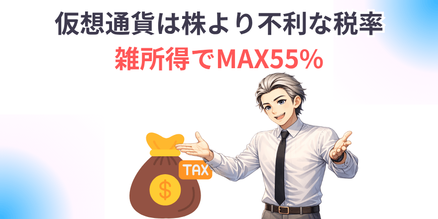 • 仮想通貨の利益は「雑所得(総合課税)」で、給与所得と合算して最大55%の税率が適用される